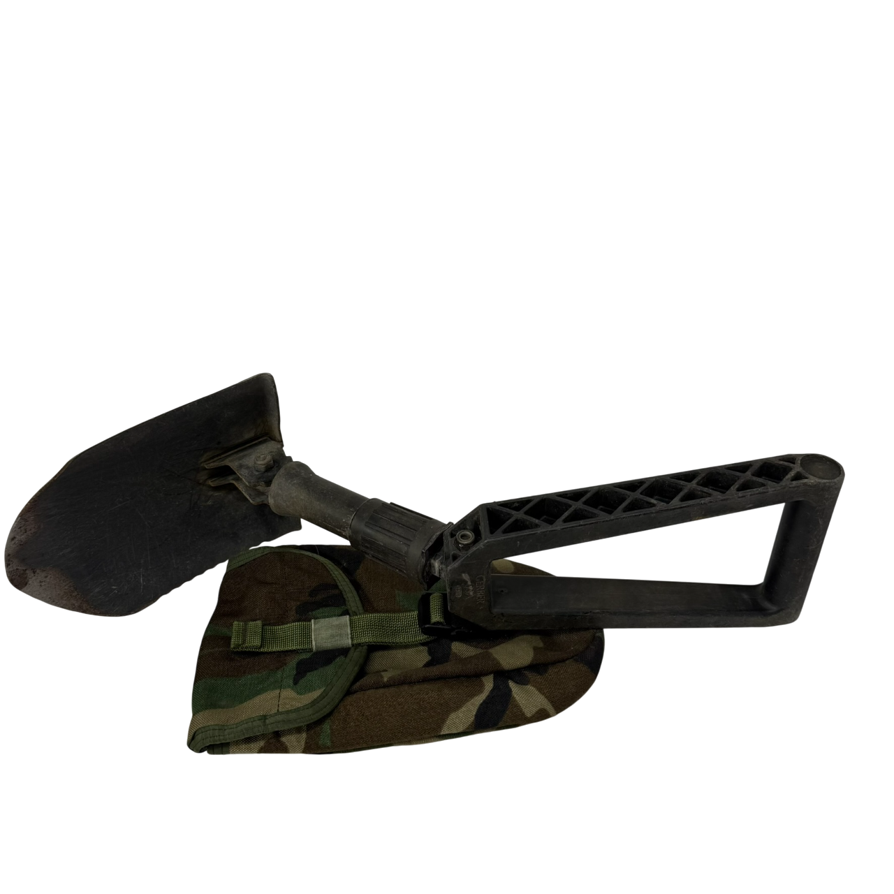 USGI Entrenching Tool (E-Tool) with Carrier — Woodland Camo (M81, Both Used and Repaired)